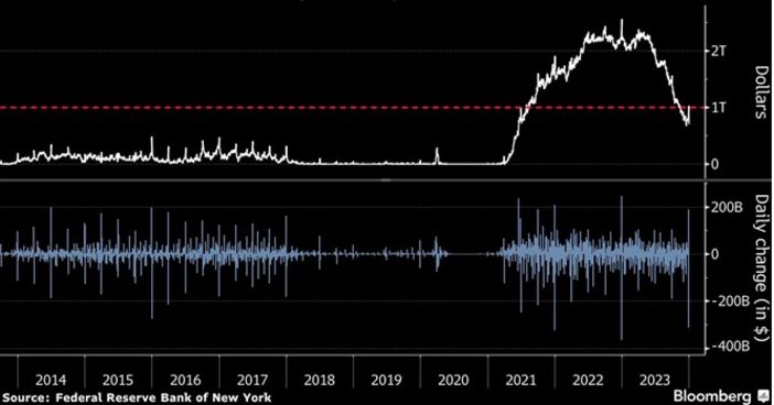 Fed’in kısa vadeli faiz oranlarını denetim etmek için kullandığı çok değerli araçlardan biri olan zıt repo sistemi (RRP) 2022 sonunda gördüğü rekor düzey olan 2,5 trilyon dolar düzeyinden, Fed’den faiz indirim beklentilerinin artmasıyla eridi. Karşıt…