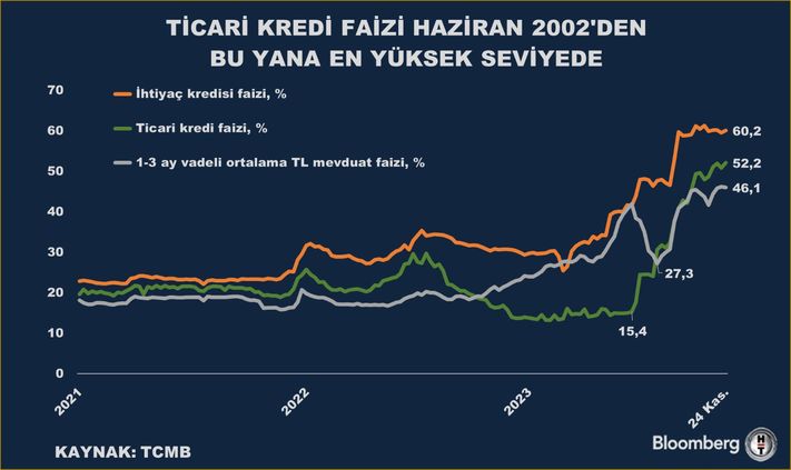 Türkiye Cumhuriyet Merkez Bankası (TCMB) datalarına nazaran, 24 Kasım haftası itibariyle ortalama ticari kredi faizi yüzde 52,19 ile 2002’den bu yana en yüksek düzeye çıktı.