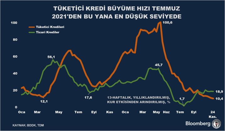 BDDK bilgilerine dayanarak yapılan hesaplamaya nazaran, tüketici kredilerinde büyüme yüzde 10,4 düzeyine gerileyerek Temmuz 2021’den bu yana en yavaş düzeye indi. Ticari kredi büyüme suratı ise yüzde 19 düzeyinde gerçekleşti.