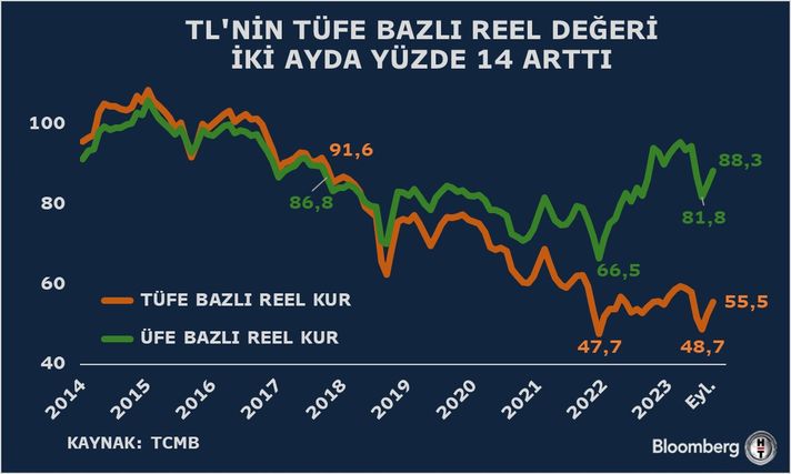 Eylül’de TÜFE bazlı gerçek efektif döviz kuru 55,52 oldu. Böylece iki ayda TL’nin gerçek bedeli yüzde 14 artış kaydetti.